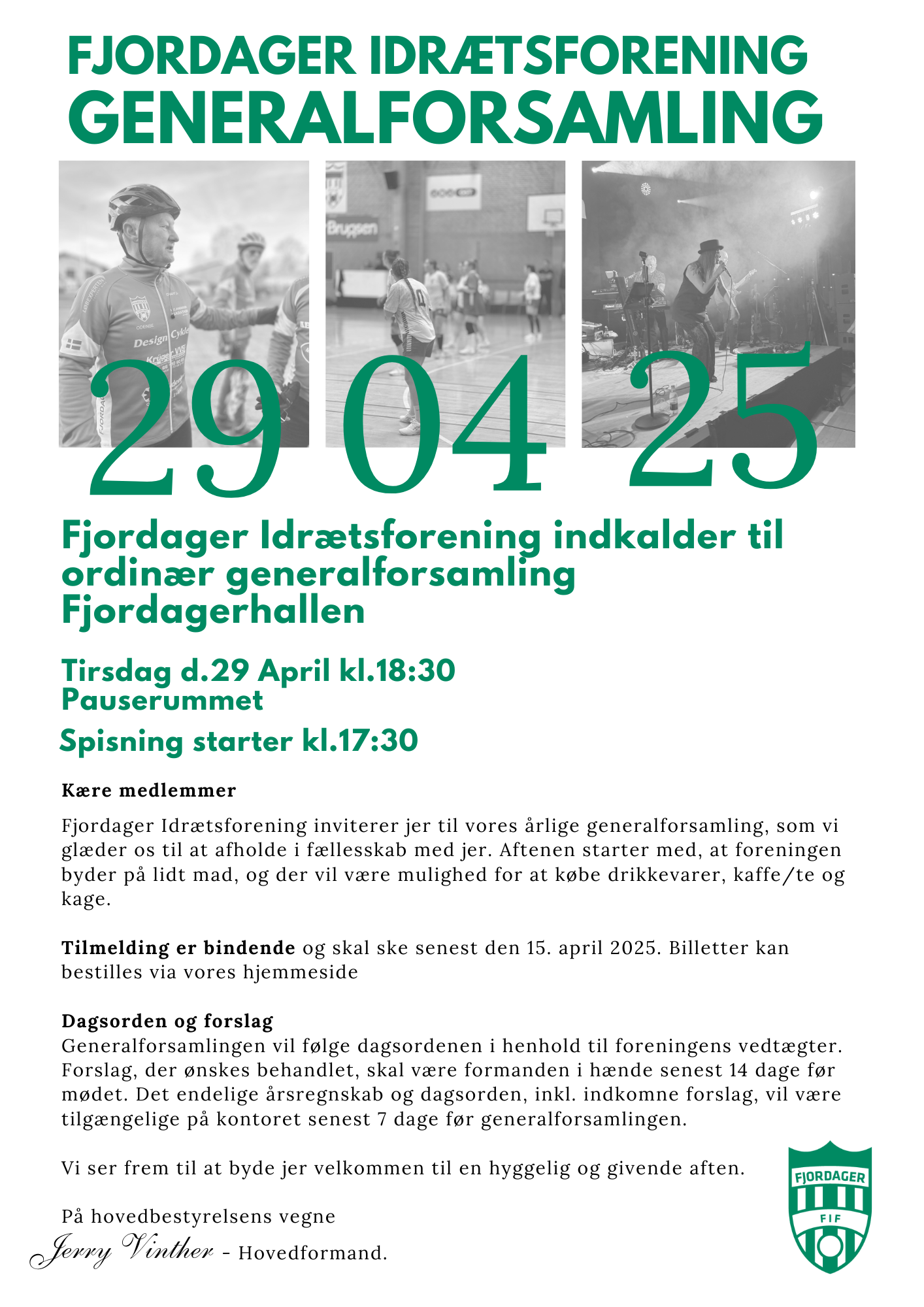 Forinden generalforsamlingen er Fjordager Idrætsforening vært ved lidt mad. Der kan købes kølige drikkevarer samt kaffe/te og kage.Spisningen starter kl. 17.30.Det er bindende tilmelding senest den 15.04.26 via billetter her på hjemmesiden!